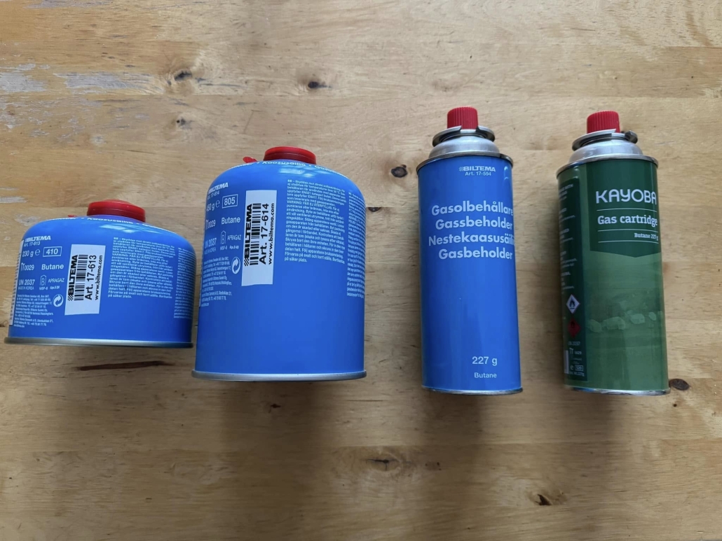 Samt 1st Biltema campingflaska 230gr och 1st Biltema campinggasflaska 450gr. Alla flaskorna utom Kayoba var påbörjade och använda innan. Ingen av gasflaskorna/patronerna är vintergas.
