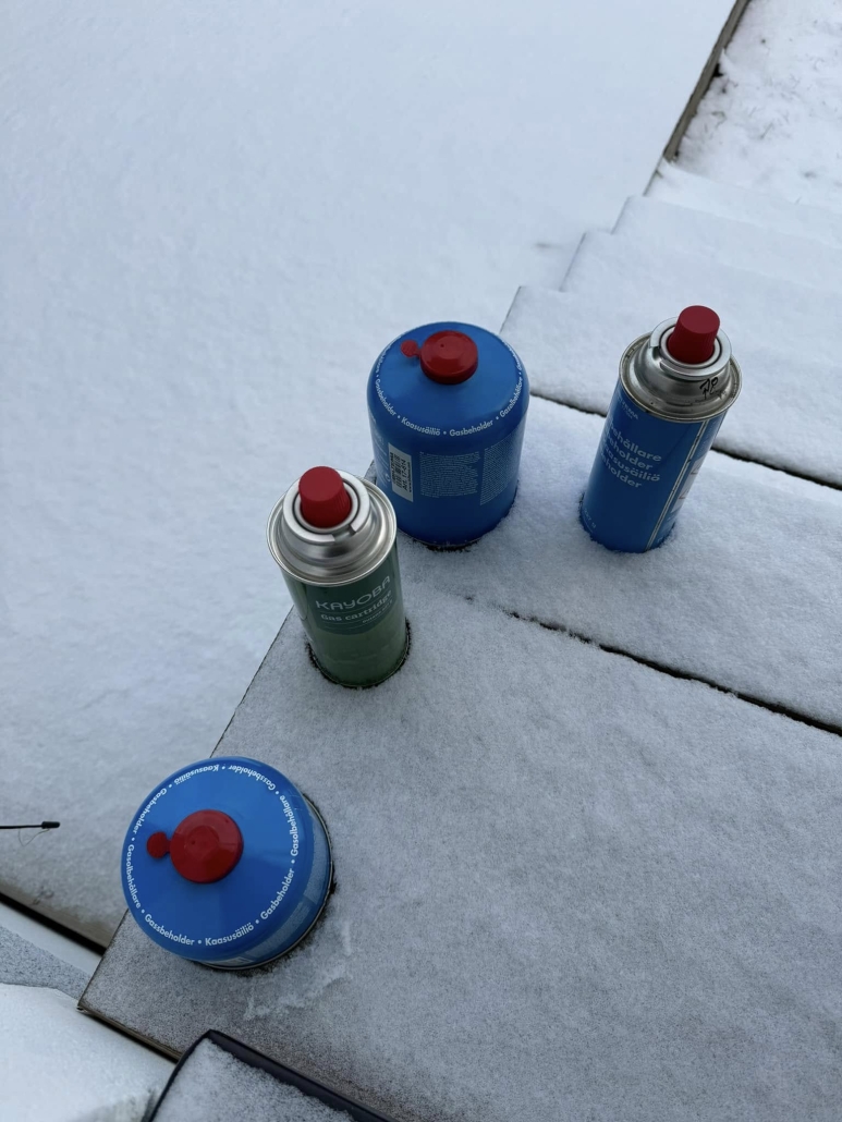 Sagt och gjort, jag slängde ut 4 olika gasflaskor ute. 2st gaspatroner 227gr i sprayburks format (Biltema och Kayoba)